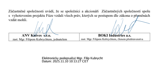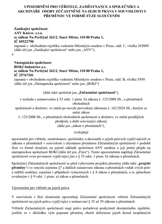 Tento krok je formálně administrativní povahy a nemá vliv na plynulost provozu ani na plnění závazků vůči zákazníkům, partnerům či dodavatelům. Veškeré činnosti, závazky a obchodní vztahy přecházejí na nástupnickou společnost BOKI Industries a.s., přičemž provoz pokračuje bez přerušení a bez potřeby jakékoliv akce ze strany třetích osob.